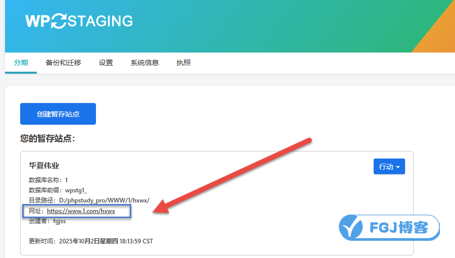 暂存站点:在你网站的根目录自动创建一个备份站点和一个专属的根目录网址,功能和你的主站点一模一样。另外特别注意,命名暂存站点名字时必须为英文,不要出现中文,否则备份站点网址会出现特殊符号。