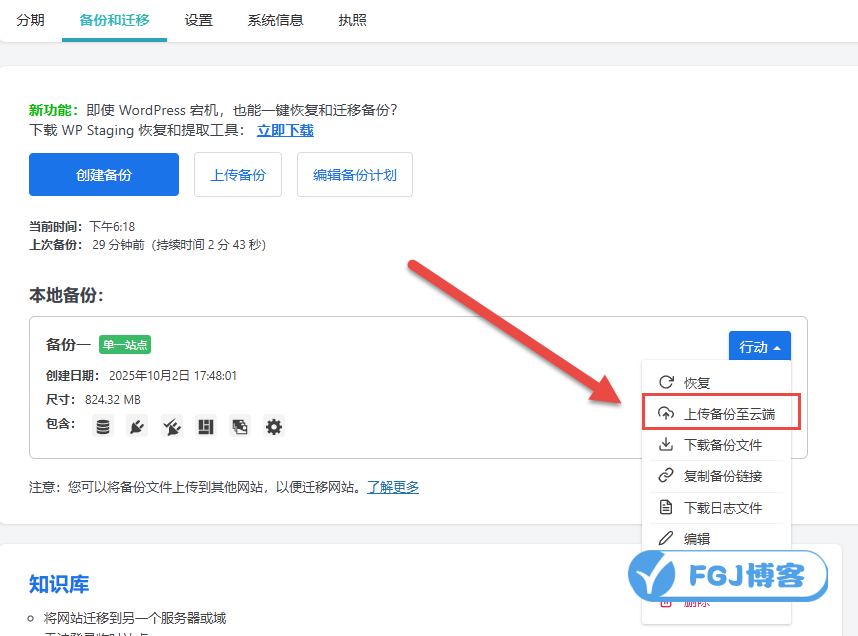 操作路劲:创建备份之后,在备份数据右侧单击“行动” – “上传备份至云端”,选择相应平台接口。