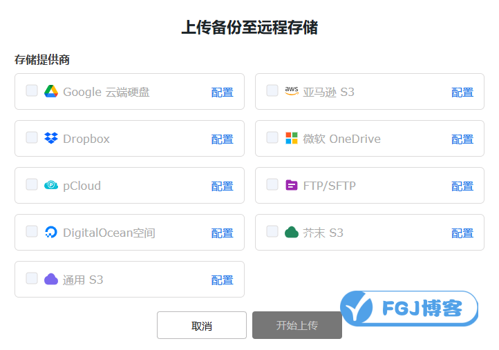 如果要上传到云端,WP Staging Pro也内置了市面上主流的平台或服务,如Google Drive、FTP、亚马逊等。