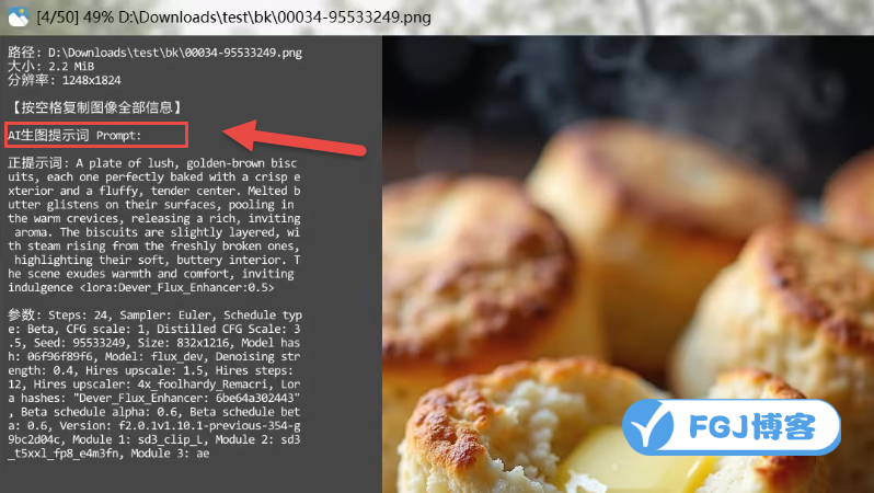 特别值得一提的是,jarkViewer 能显示 stable-diffusion、Flux 等 AI 生图内嵌的提示词,前提是图片中已保存该信息。